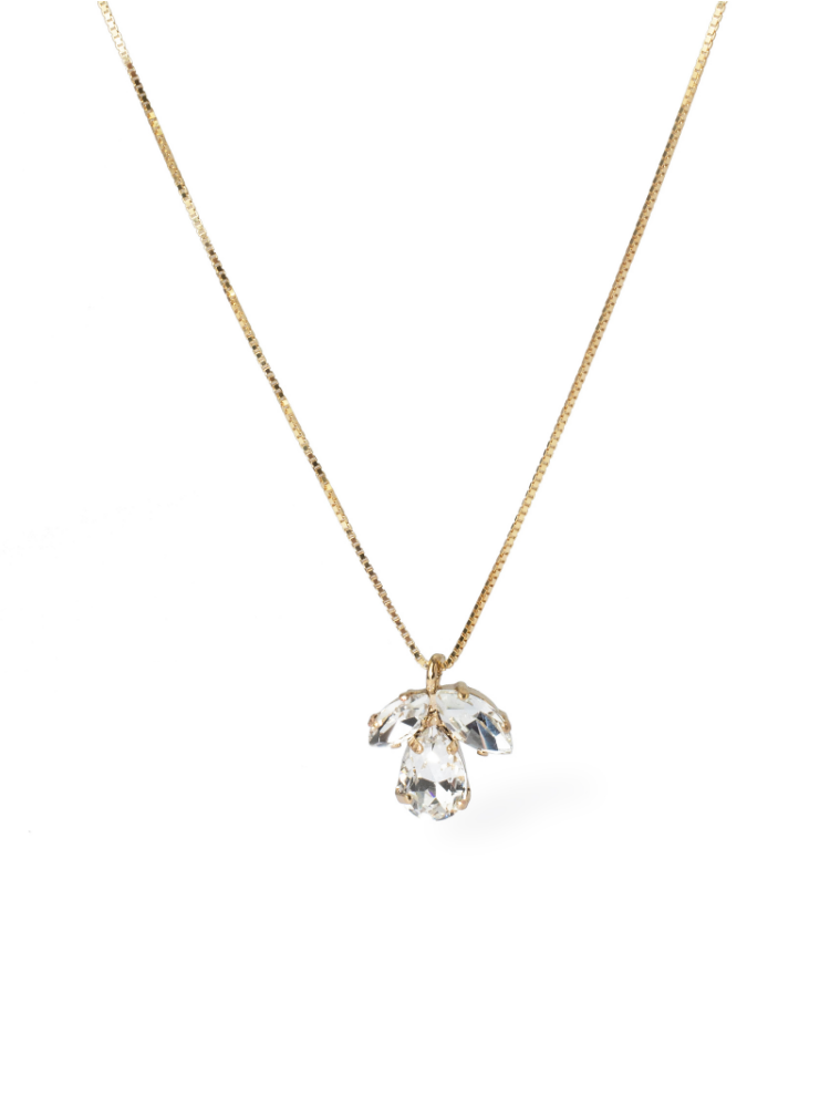 Le pendentif est plaqué or 14kt et fabriqué avec des cristaux de haute qualité et du laiton durable, et se suspend magnifiquement à une élégante chaîne en forme de boîte.