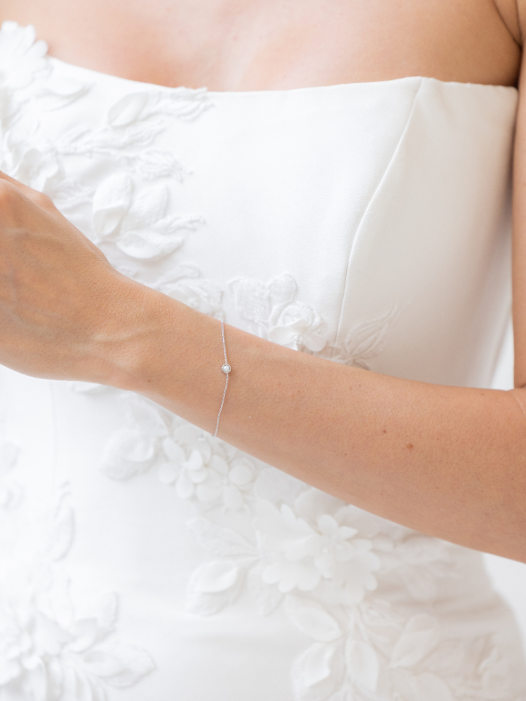 Bracelet fin et élégant, orné d’un détail central délicat pour une allure fraîche et douce. Doté d’une chaîne réglable et d’un fermoir sécurisé. Parfait pour les looks de mariée légers et les occasions spéciales.