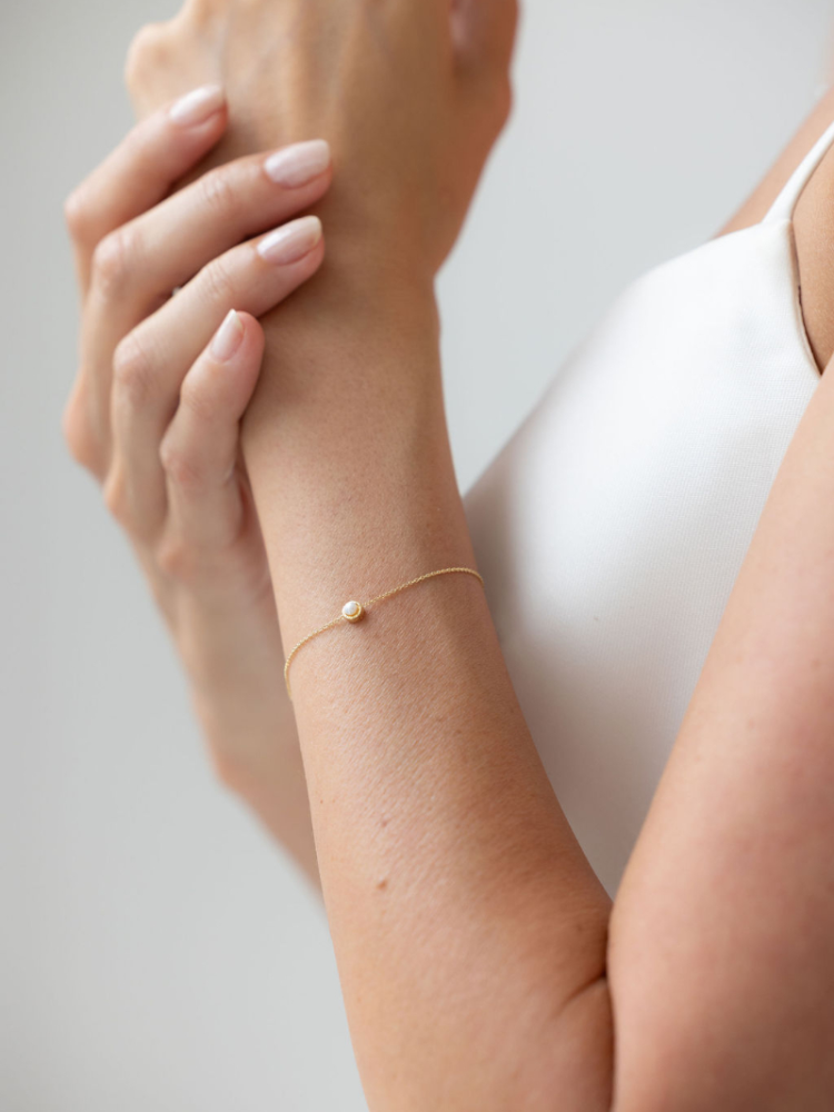Bracelet fin et léger avec un détail central délicat pour une touche douce et romantique. Chaîne ajustable avec fermoir sécurisé pour un porté confortable. Idéal pour un style de mariée léger et élégant.