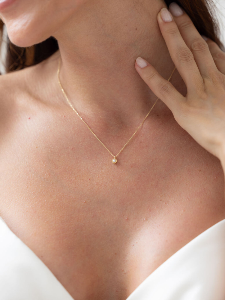 Collier fin au design délicat et raffiné, apportant une touche douce et élégante au décolleté. Léger et confortable à porter, avec fermoir sécurisé. Parfait pour compléter une tenue de mariée classique et élégante.