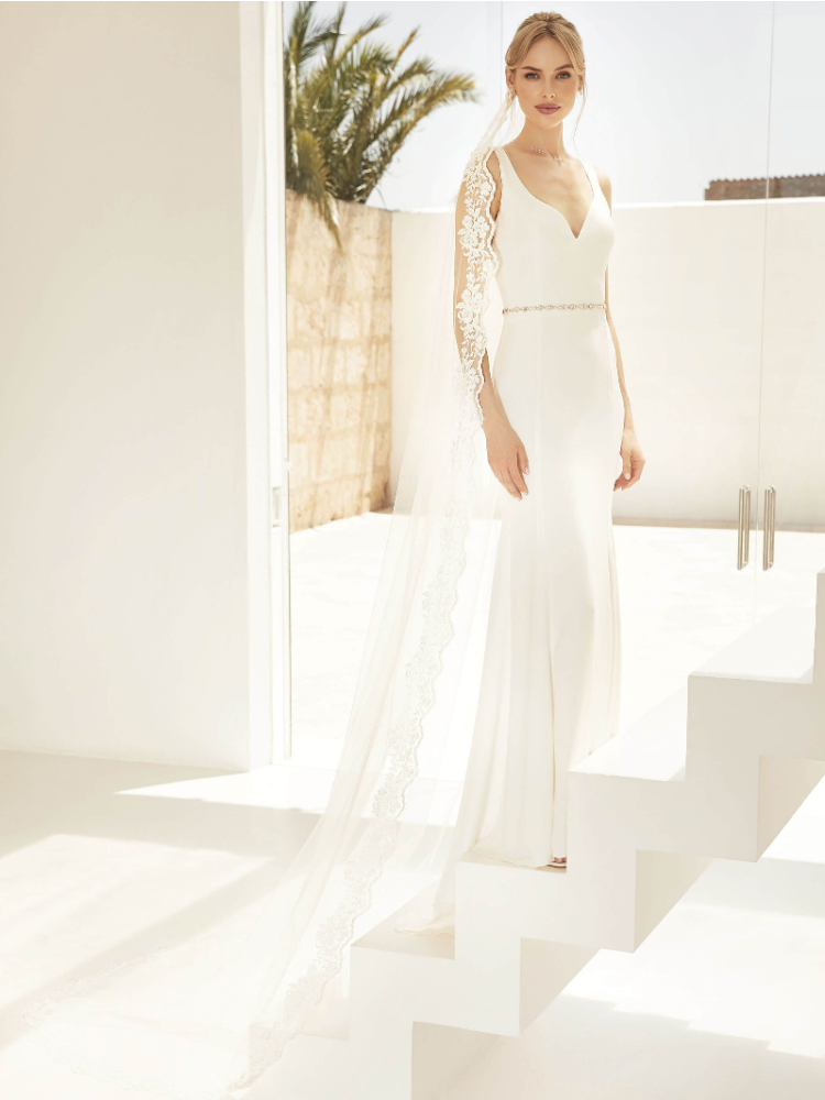 Ce voile élégant de Bianco Evento complètera votre look de mariée. Ce voile à une couche est fait de tulle diamanté avec un bord en dentelle avec des perles de verre. Un peigne est attaché au voile, ce qui facilite la mise en place du voile dans les cheveux.