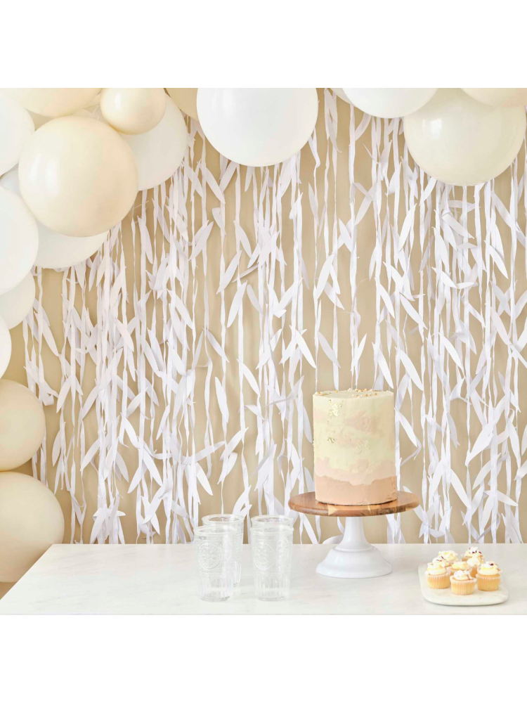 Cette superbe toile de fond en feuilles blanches complète votre espace en tant que pièce maîtresse accrocheuse. La couleur blanche est une toile de fond polyvalente qui peut être utilisée comme toile de fond de photobooth ou pour votre réception.