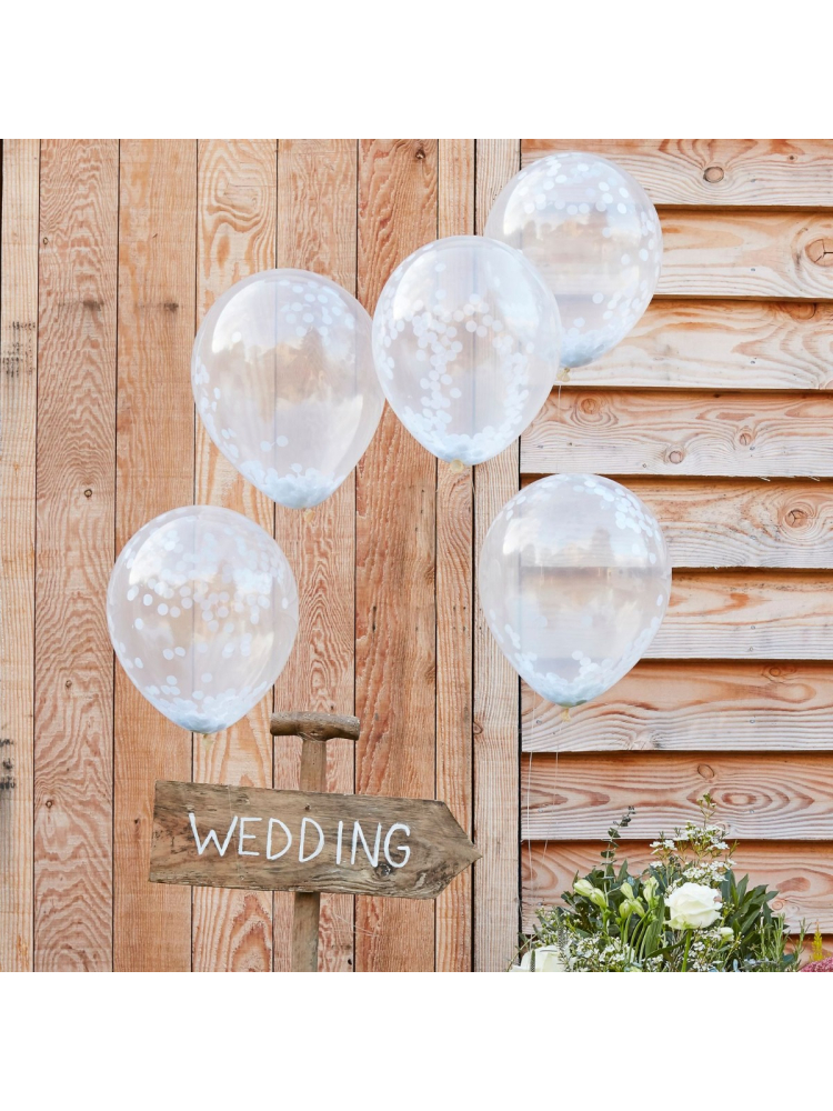 Les ballons sont transparents et remplis de confettis blancs.