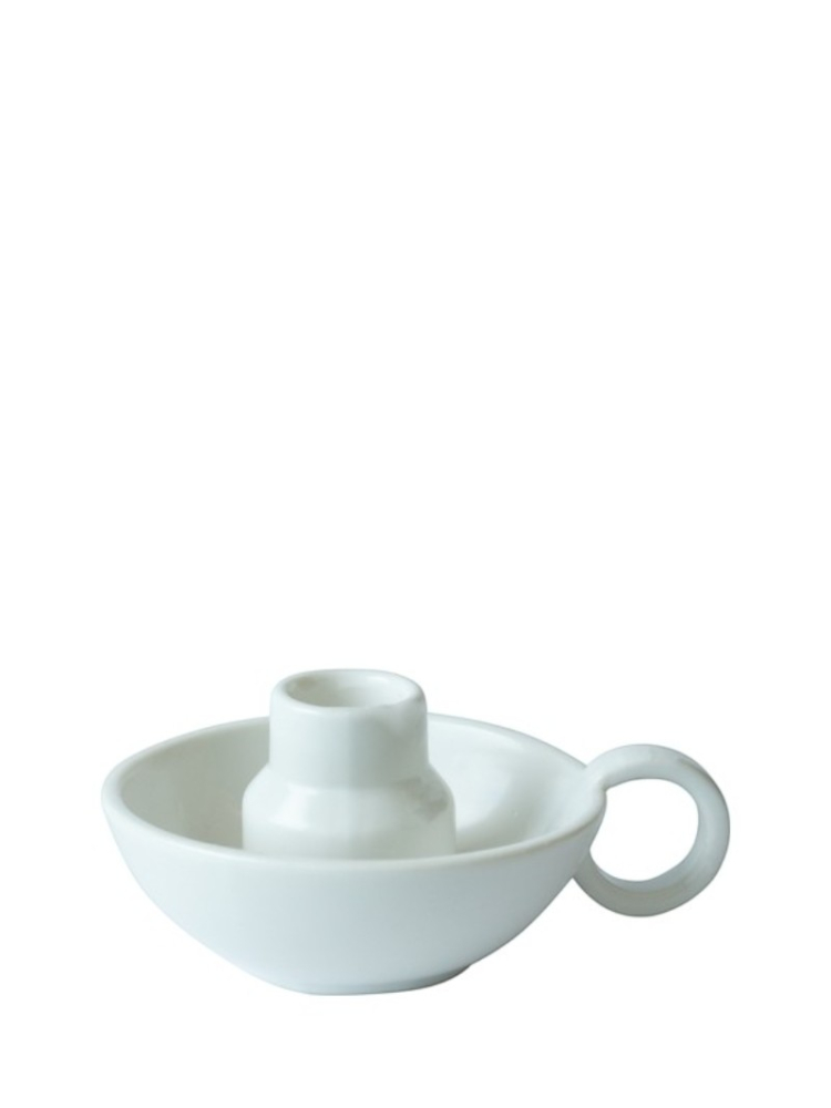 Un souffle discret sur la table : le bougeoir Chris apporte une élégance nuptiale tout en sobriété, avec sa présence blanche satinée et sa petite anse circulaire.