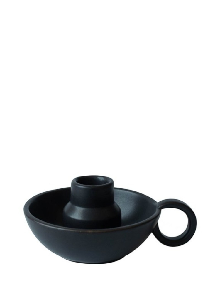 Façonné à la main en céramique noire mate, 6 x 14 cm, il accueille une bougie effilée et se pare d'une anse circulaire délicate ; sa lueur chaleureuse évoque les vœux murmurés et en fait un cadeau intime, élégamment présenté.