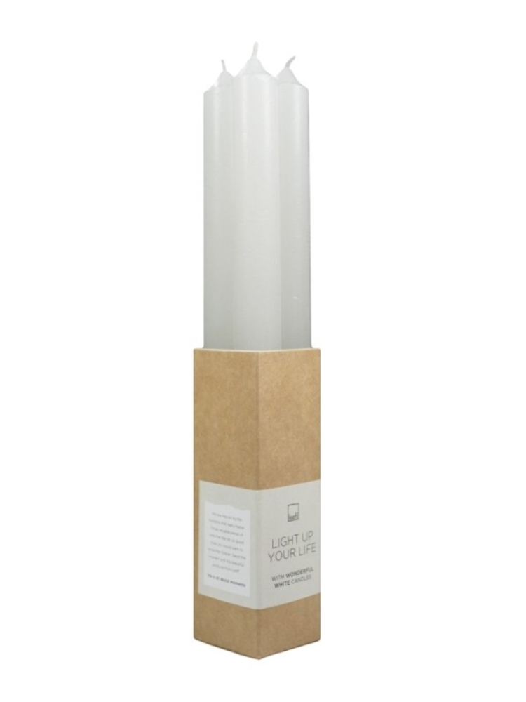 De teinte blanc doux, chaque bougie mesure 25 x 2 cm et offre environ 10 heures de combustion. Leur surface subtilement irrégulière diffuse une flamme stable et intime. Elles sont présentées dans un coffret kraft sobre, orné de l'inscription "Light up your life with wonderful white candles".