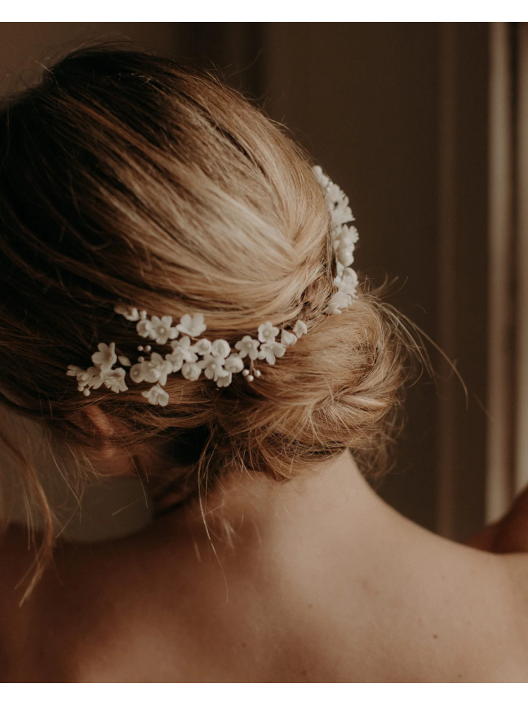 The Blanche comb is a soft, romantic piece with tiny handcrafted flowers made from cold porcelain and delicate mother-of-pearl details. The off-white (soft ivory) tones blend beautifully into your hair for an effortless bridal look. Super lightweight, 12 cm long, and handmade in Paris — perfect to wear on one side or double it for a fuller effect.
