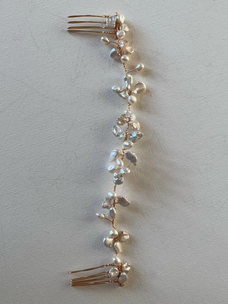 La Nova Hairvine Or de Sally Jane Bridal est un accessoire de cheveux raffiné et polyvalent qui allie harmonieusement élégance et charme naturel. Fabriquée à la main avec soin, cette vigne flexible de 18 cm présente des perles brutes de forme organique et des perles d'eau douce lumineuses délicatement intégrées sur une base dorée. Son design léger et malléable vous permet de l'intégrer facilement dans des tresses, des chignons bas, des coiffures demi-relevées ou des vagues légères et romantiques, ce qui en fait un choix parfait pour les mariées modernes, naturelles ou bohèmes. Son éclat subtil et ses formes organiques apportent une touche rêveuse et sophistiquée qui se marie à merveille avec des voiles ou d'autres accessoires dorés. Conçue à la main pour les mariées qui apprécient le luxe discret et la romance intemporelle.