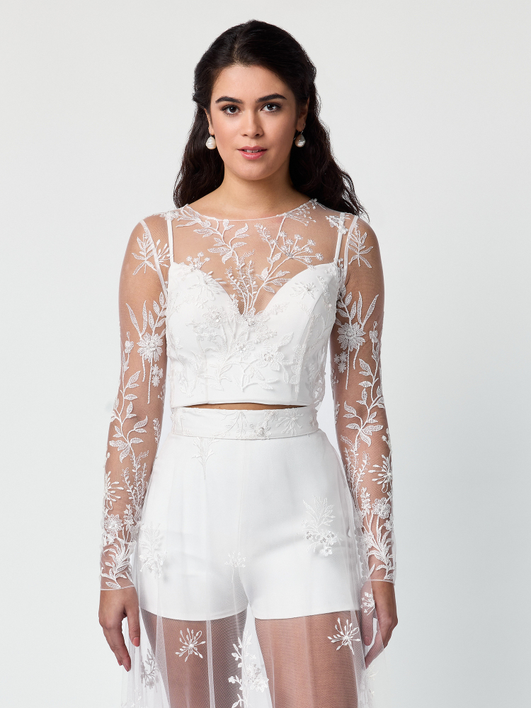 Le haut Poirier T-75417 présente des manches longues en tulle ivoire brodé, orné de sequins et de perles. Avec un design floral romantique et une fermeture classique par boutons au dos, il s'associe parfaitement avec les articles assortis de la ligne Uma. Idéal pour ajouter une touche de charme doux et élégant à votre tenue de mariée.