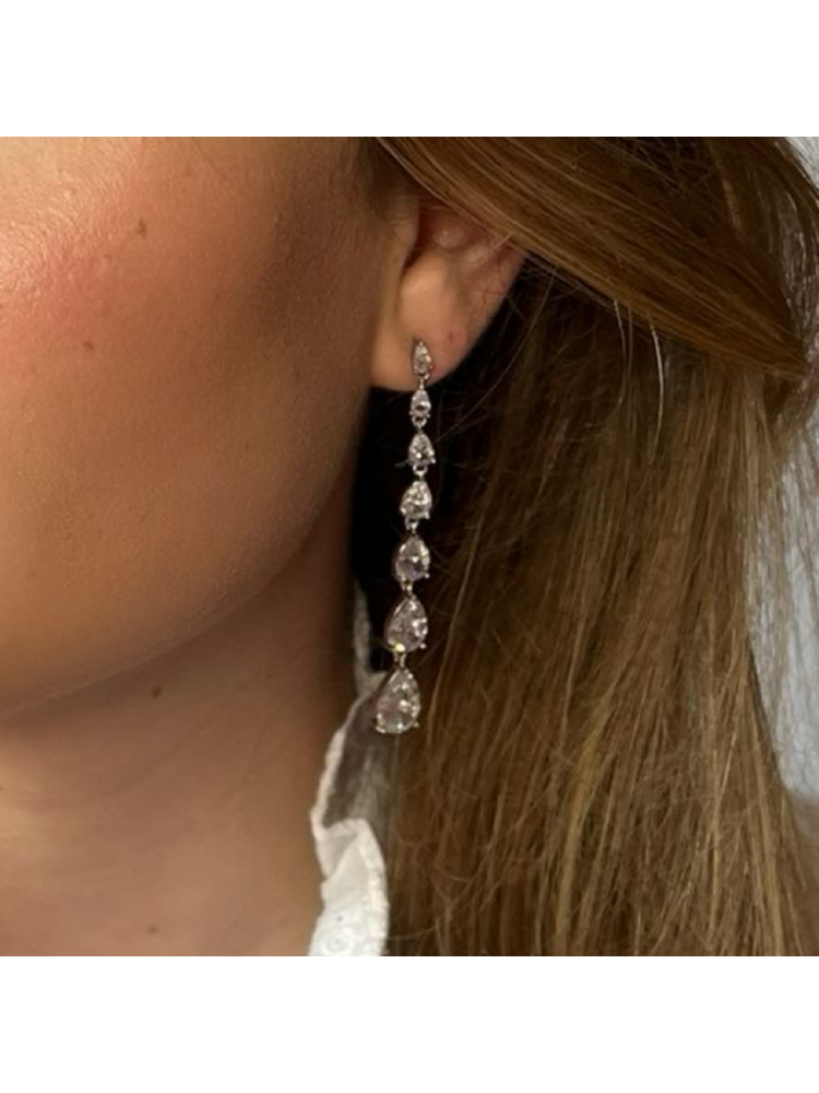 Add instant glamour to your bridal look with the dazzling Ella earrings from the Sally Jane Bridal collection. These long, silver-plated earrings are adorned with sparkling zirconia stones in an elegant drop design, catching the light beautifully with every movement. Their cascading silhouette elongates the neck, creating a refined and graceful appearance. Crafted from high-quality stainless steel with a silver finish, they combine durability with timeless elegance. Perfect for brides who love statement accessories with vintage charm, the Ella earrings are a striking choice to complete both modern and classic wedding styles.